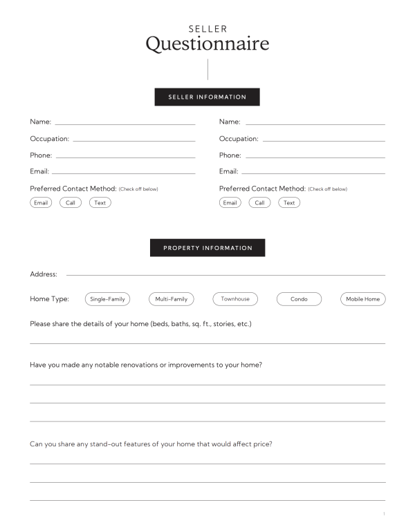 This Seller Questionnaire will help you find out important features of your clients' home, the minimum price your clients will accept, their motivations for moving, and more.