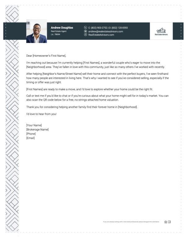 Connect with homeowners using a personalized, low-pressure letter that highlights real buyer demand and neighborhood appeal.